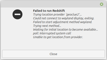 If I run Redshift in Linux Mint (Cinnamon version) I get following error: